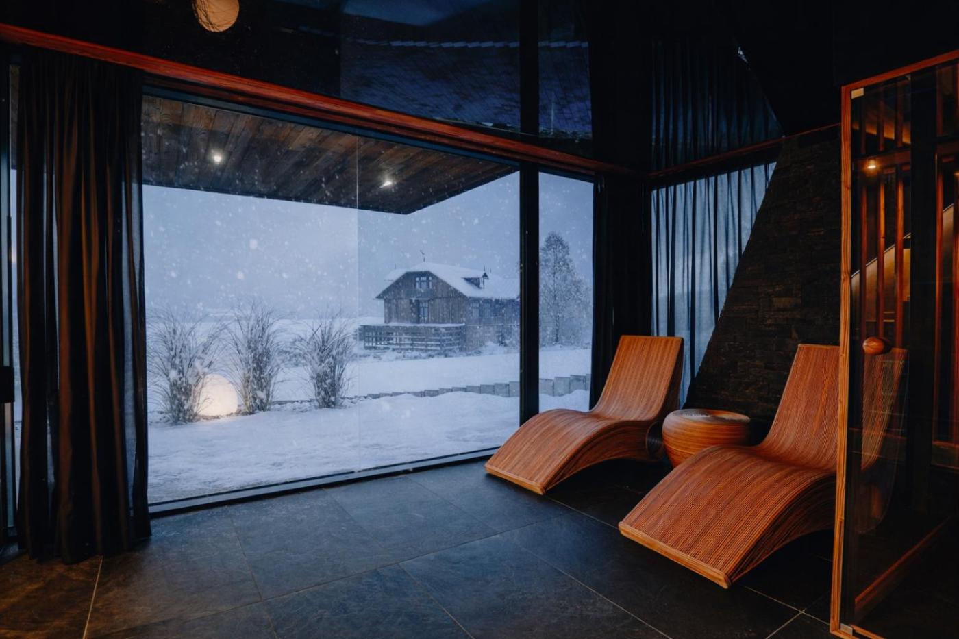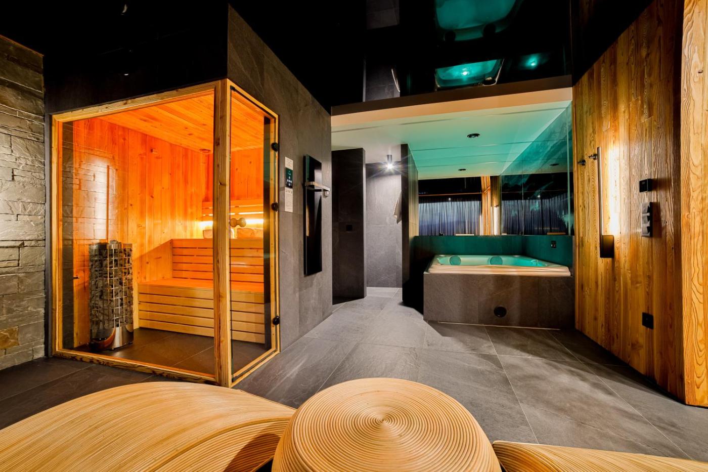 Zaplecze odnowy biologicznej obiektu Czorsztyn Prestige Osada - luksusowe apartamenty dla dorosłych i dzieci od 12 lat - z bajkowym widokiem na jezioro obejmuje saunę i wannę z hydromasażem.